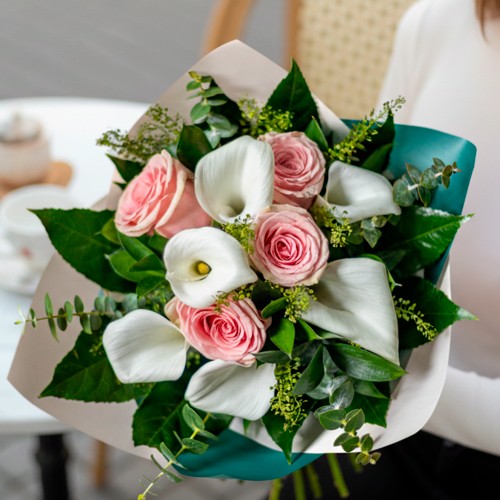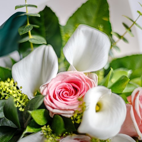 🌿 Este exquisito ramo combina la pureza de las calas blancas con la delicadeza de las rosas de color rosa, creando una composición armónica que exuda sofisticación. Los verdes decorativos añaden un toque de frescura, realzando la belleza natural de cada flor.