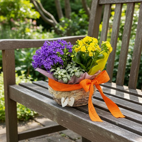 🌸 Cesta de mimbre de alta calidad con decoración de corazones pequeños, con platas naturales variadas.