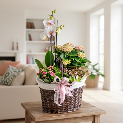 🌸 Cesta grande de mimbre (Capazo) decorada con 5 plantas naturales, Orquidea Phalaenopsis, Hortensia, Kalanchoe de color, Fitonia y hiedra.
