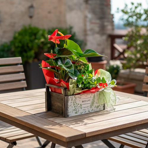 🌸 Caja de madera mediana decorada muy elegante con 3 plantas naturales, Anturihum, Kalanchoe y Hiedra