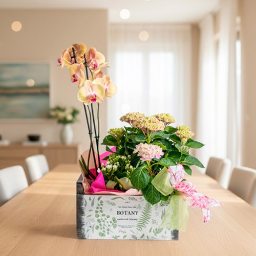 🌸 Caja de madera decorada grande muy elegante con 3 plantas naturales, Orquidea Phalaenopsis, Hortensia, Kalanchoe.