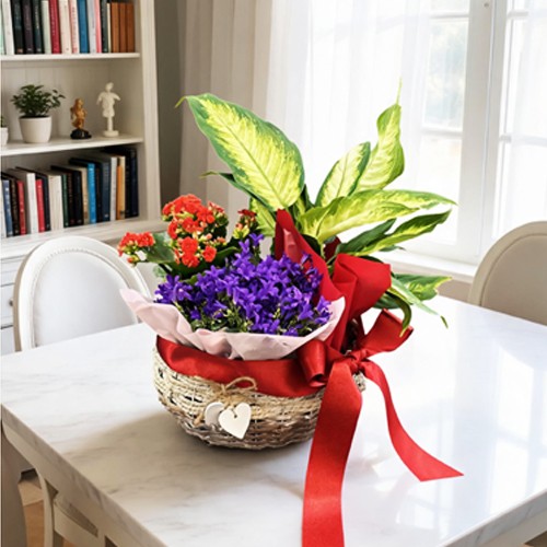 🌸 Cesta de mimbre de alta calidad mediana muy elegante con  plantas naturales variadas, con mucho color.