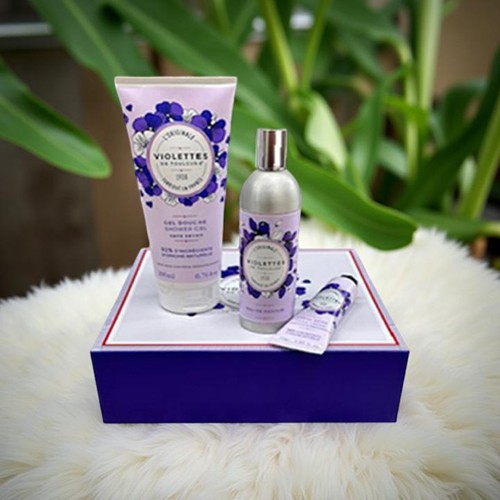 Coffret “Violetas de Toulouse” Pack de cosmética de Toulouse compuesto por una fragancia excepcional de Perfume, gel de ducha y crema de manos.