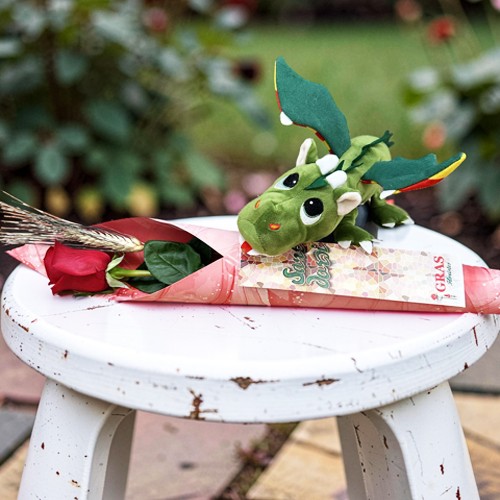 💐 Cono de plástico reforzado decorado en trencadis estilo Antonio Gaudí, con una rosa roja extra “Freedom” , espiga natural seca, pick de madera decorado en una rosa y libro y peluche grande dragón.