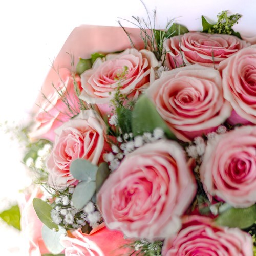 🌿 Este hermoso bouquet apiñado de rosas en tonos rosados, acompañado de verdes variados, es un símbolo de esperanza y alegría. Cada rosa ha sido cuidadosamente seleccionada para transmitir un mensaje de ilusión y buenos deseos, creando un conjunto lleno de encanto y significado.