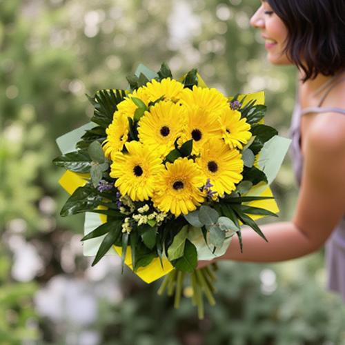 Bouquet de 10 gerberas amarillas y verdes decorativos.