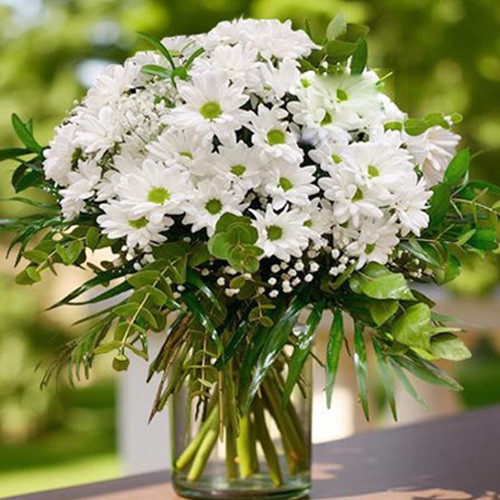 Ramo de margaritas blancas naturales con varios verdes decorativos.