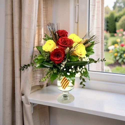 💖 Bonita copa de cristal con tres rosas extras de color amarillo y tres rosas extras de color rojo, verdes variados