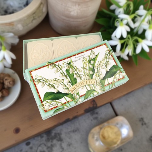 Llegados directamente de la Toscana esta maravillosa caja decorada con tres pastillas de 125g cada una de jabón auténtico, cremoso, especial. “Saponificio Artigianale Fiorentino” con un intenso aroma de la flor del Muguet. Este jabón de alta calidad hidrata la piel y le aporta un gran aroma dejando los sentidos libres para caminar por los senderos que nos recuerdan a los jardines de flores en primavera. Emoliente e hidratante limpia la piel sin dañar el ph natural. Un regalo diferente!!