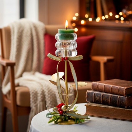 🌿 Candelero de metal dorado decorado de Navidad con 1 vela artificial en color verde.