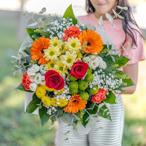 🌿 Este Ramo espiral, cuidadosamente compuesto de flores naturales en tonos naranjas, amarillos y blanco, rosas rojas extras es una explosión de color y alegría. Los verdes variados complementan a la perfección este conjunto radiante, creando un equilibrio visual que captura la energía del sol y la frescura de la naturaleza.