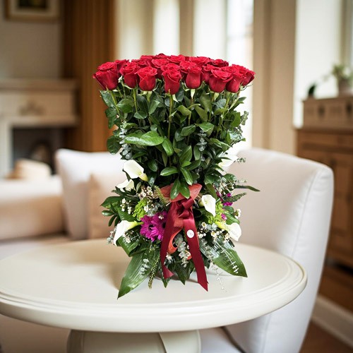 🌿 Este encantador arreglo de 20 rosas rojas super extras “Freedom” captura la esencia del romanticismo y la sofisticación. Acompañadas por verdes decorativos que realzan su vibrante color, estas rosas son seleccionadas por su calidad y belleza excepcionales, y un parterre de flores variadas para complementar esta creación floral, creando un centro lleno de pasión y elegancia.