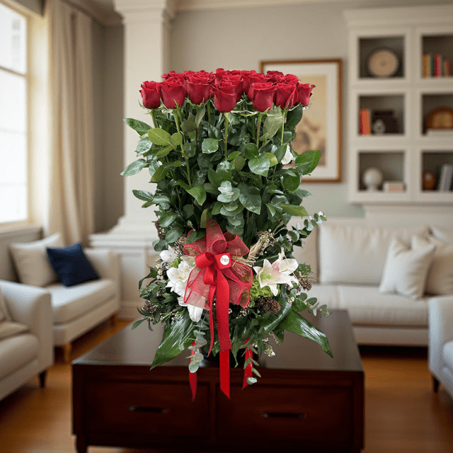 🌿 Este encantador arreglo de 30 rosas rojas super extras “Freedom” captura la esencia del romanticismo y la sofisticación. Acompañadas por verdes decorativos que realzan su vibrante color, estas rosas son seleccionadas por su calidad y belleza excepcionales.
